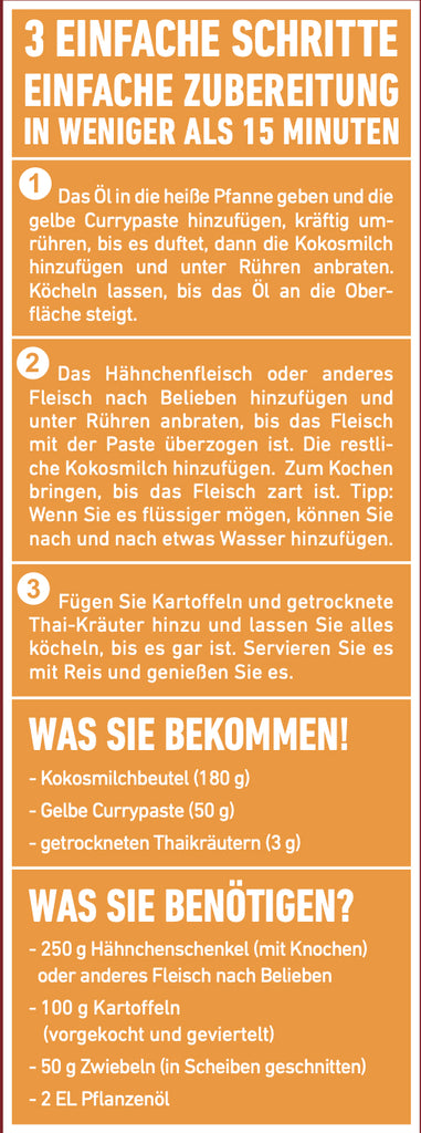 In nur 15 Minuten zauberst du ein authentisches Thai Yellow Curry, so lecker wie im Urlaub. Einfach Zutaten wie auf der Kochanleitung hinzufügen, kurz köcheln – fertig ist ein duftendes Geschmackserlebnis für mindestens zwei Personen. Perfekt mit Jasminreis oder Kartoffeln genießen.