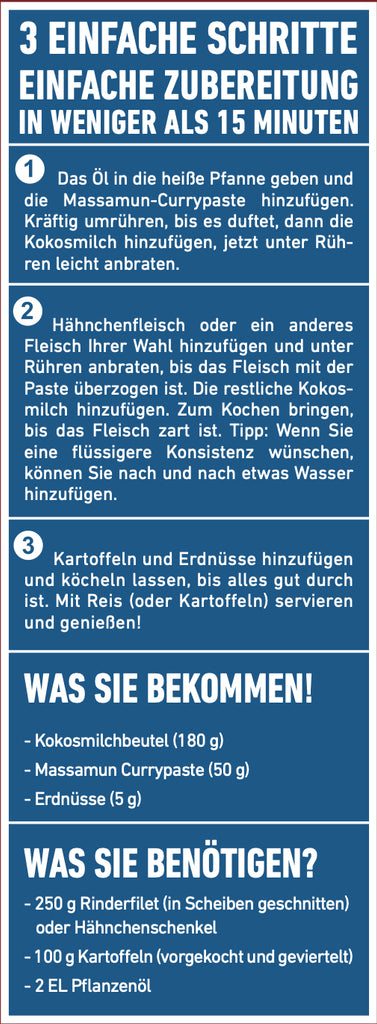 In nur 15 Minuten zauberst du ein authentisches Thai Massamun Curry, so lecker wie im Urlaub. Einfach Zutaten und frisches Gemüse hinzufügen, kurz köcheln – fertig ist ein duftendes Geschmackserlebnis für mindestens zwei Personen. Perfekt mit Jasminreis oder Kartoffeln genießen.